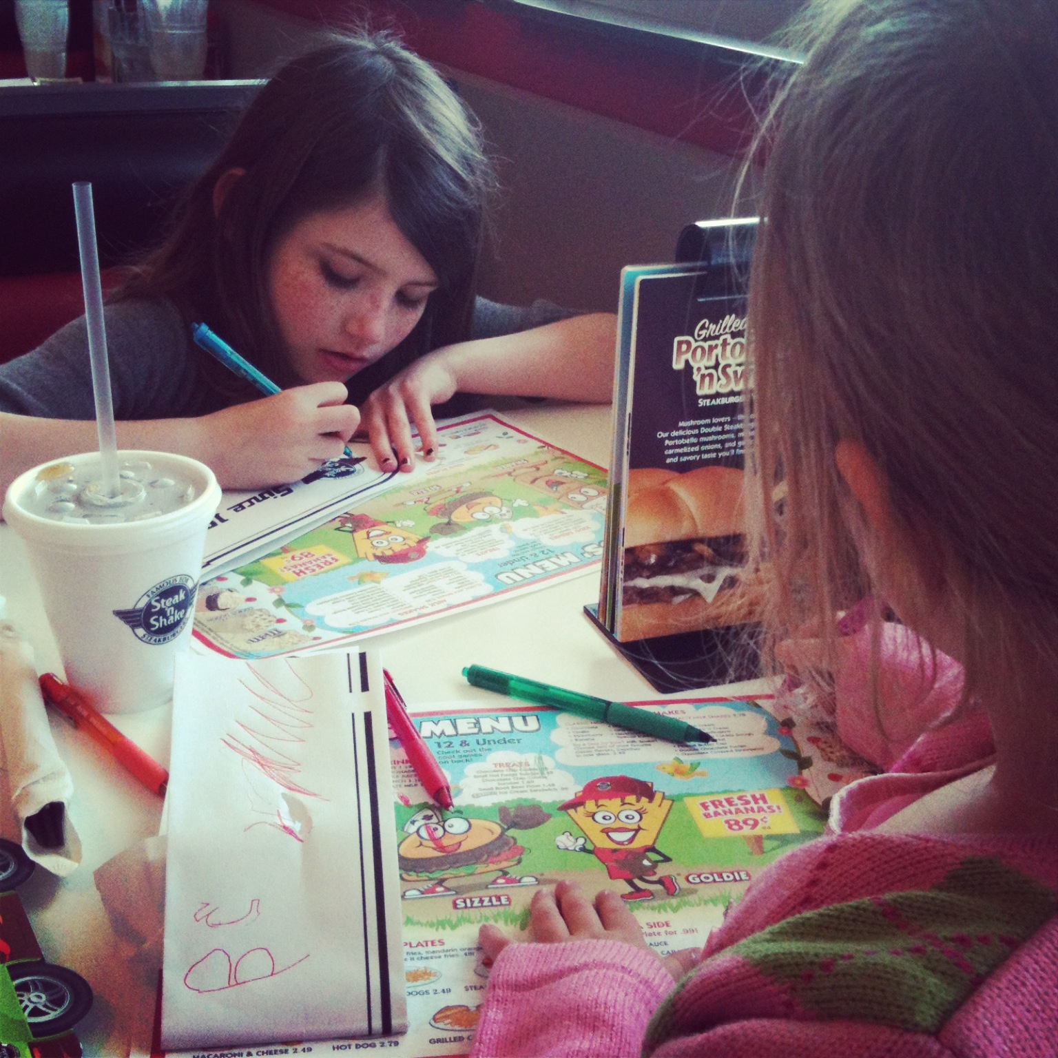 Lunch at Steak 'n' Shake was up next. Thank goodness I carry tons of writing utensils in my purse for coloring sheet fun.